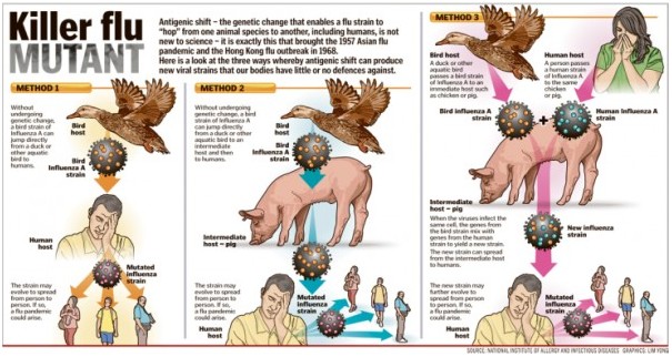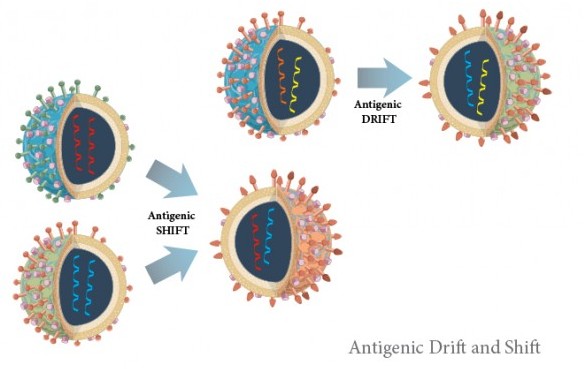 除了高突變率之外,不同物種間的甲型流感病毒的重組(shifts)也賦予了其易變異的特性。目前所知,甲流病毒基因組共編碼12個病毒蛋白,分布于8條RNA片段上。當一個宿主體內(nèi)感染兩種或兩種以上甲型流感病毒時,重組就有可能發(fā)生,不同種病毒之間交換一些RNA,進行重組。比較容易察覺的是HA和NA的互換,如H1N1遇到H2N3再經(jīng)過互換以后,理論上就有可能形成H1N3、H2N1等新亞型。同時,病毒的傳染性和致病性基因也可能發(fā)生交換,從而使病毒變得更弱小,或者,糟糕地變得更強大……
